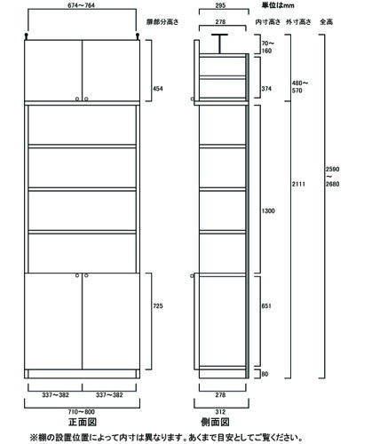 【オプション加工】1.5cm棚板ピッチ、幅木よけ、(配線用)裏板穴加工、タフ棚板穴加工 等 ※幅違い・高さ違い・奥行違いは全サイズ別一覧よりお選び下さい 大容量壁面書庫 タフ棚板(厚さ2.5cm) 奥行31cm×高さ259.1〜268.1cm×幅71〜80cm サイズオーダー ウッドラック 幅は1cm単位で指定 大容量壁面書庫 本体高さ211.1cm 突張棚高さ41cm 本体扉高さ72.5cm(下扉) 突張棚扉高さ45.4cm ご注意 オプション加工を選択されても価格が自動計算されません。
